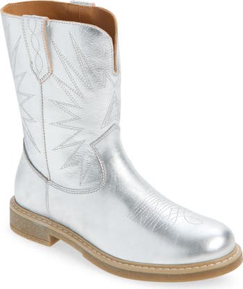 Intricate topstitching and a dipped topline perfect the classic Western styling of this handcrafted, kid-sized metallic-leather boot complete with a Broken Star logo for a signature kick.