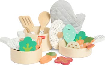 Includes: This 19-piece set includes a stock pot and pans with lids, cooking utensils, a wearable pretend oven mitt and 11 food play pieces for kids to cook and serve.