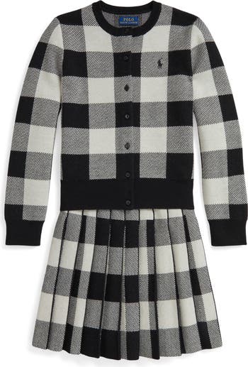 A classic check pattern elevates this charming wool-knit set featuring a button-up cardigan and pleated skirt your kid will love.