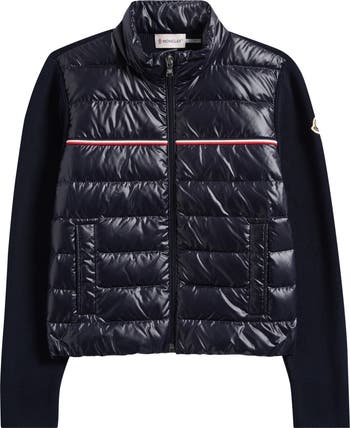 This hybrid style that's part puffer, part cardigan keeps your little one warm in transitional temps with a combination of cotton-knit sleeves and back along with a down-filled core. Tricolor trim and a logo patch bring house-signature touches to the style.