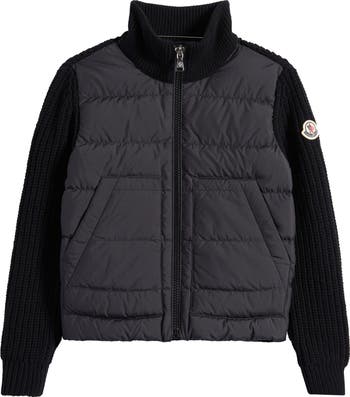 Part puffer, part cardigan, this hybrid style helps keep your kiddo warm in transitional weather with a combination of wool knit sleeves and back and a down-filled core.