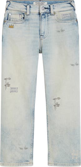 Little artists will love the edgy, streetwear-inspired style of these faded, loose-fitting jeans featuring doodles inspired by Jean Michel Basquiat's artwork.