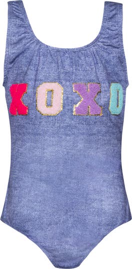 Your child will be easy to spot in this playful one-piece swimsuit featuring a denim-inspired knit and colorful XOXO appliqués at the chest.