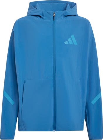 Movement-enhancing, stretchy woven fabric ensures your active kid stays comfortable no matter what adventure they tackle in this lightweight, hooded jacket built with Climacool tech to manage sweat.