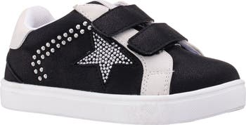 Shimmery studs, rhinestones and a star detail accent the upper of a low-top sneaker built with memory foam cushioning to support their stride from classroom days to weekend outings.