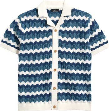 A zigzag knit lends crochet-inspired dimension to this kid-size button-up shirt made from cotton yarns for a look that's polished and comfortable.