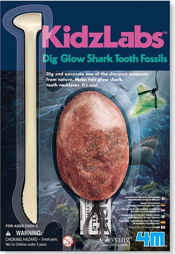 4M: DIG & EXCAVATE GLOW SHARK TOOTH FOSSILS - Unearth the mysteries of the past with the KidzLabs Dig Glow Shark Tooth Fossils Kit! This educational and engaging kit lets children dig for their own glow-in-the-dark shark tooth fossils, providing endless hours of entertainment. Complete with all necessary materials, including a digging tool and detailed instructions, this kit guides young explorers through the excavation process. By following the step-by-step guide, children will learn about the principles of paleontology and the fascinating world of sharks. This hands-on project enhances understanding of paleontology while promoting scientific curiosity and creativity. Inspire a love for science and the natural world with this innovative and interactive kit. As children excavate fossils, they develop fine motor skills and unleash their creativity. The KidzLabs Dig Glow Shark Tooth Fossils Kit is a fantastic way to combine fun and learning, making it an excellent gift for budding scientists. Plus, kids can create two cool glow-in-the-dark shark tooth necklaces, showcasing one of nature's sharpest weapons! INCLUDES: 2 glow-in-the-dark shark teeth (buried in the plaster block), specially designed digging tool, length of fabric cord and instructions for making knots of the necklaces. Contents for making 2 glow shark tooth necklaces.