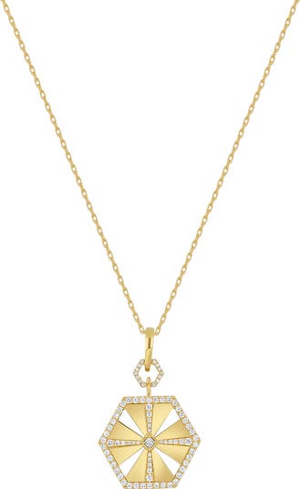 Diamonds sparkle around and through the cutout hexagonal pendant that anchors this delicate chain necklace handcrafted from 18-karat gold.