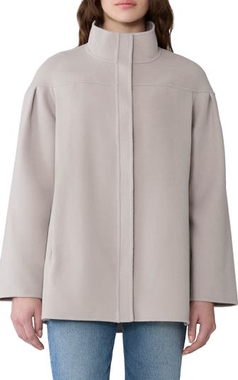 Sculptural pleats define the back yoke of this warm wool-blend coat finished with a clean funnel neckline and streamlined front.