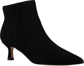 A pointy toe and flared kitten heel bring poised balance to a streamlined suede bootie featuring a cushioned footbed and full-length side zipper.