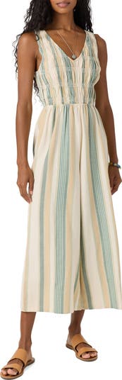 Crisp stripes in an earthy color palette dial up the retro style of this woven wide-leg jumpsuit.
