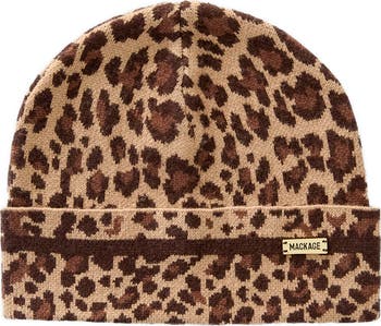 A merino-wool blend furthers the comfort of this knit beanie accentuated with a golden logo-marked cuff that plays against the on-trend cheetah pattern.