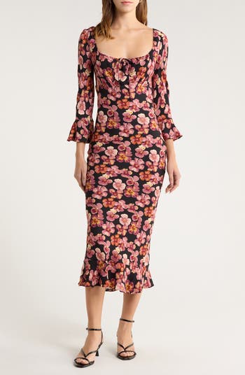 Fanciful frills at the cuffs and hem frame this flowery figure-skimming midi accented with a dainty neckline bow.