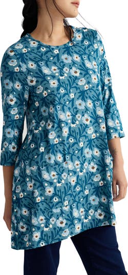 Painterly blooms pattern the soft jersey fabric of this roomy A-line tunic top popped with handy patch pockets.