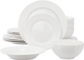 Upgrade your dining experience with the Elama Kim 16-Piece Double Bowl Porcelain Dinnerware Set in White, designed to bring a touch of elegance to any table. Made from durable, high-quality porcelain, this dinnerware set features a glossy finish that enhances its sleek, modern look. The round shape and intricate dotted embossed pattern add texture and sophistication, making it perfect for both casual meals and formal occasions. With its timeless white color, the Elama Kim dinnerware set easily complements any kitchen decor. It is also microwave safe and dishwasher safe, ensuring maximum convenience for busy households.This 16-piece dinnerware set includes everything you need to serve your family or guests in style: four dinner plates, four salad plates, four soup bowls, and four cereal bowls. The Elama Kim Porcelain Dinnerware Set is designed for long-lasting durability, making it an excellent choice for everyday use. Its microwave and dishwasher safe features make it ideal for modern living, while the glossy white finish ensures it remains a standout piece in your collection. Upgrade your table settings with the Elama Kim 16-Piece Dinnerware Set, combining elegant design with everyday functionality.