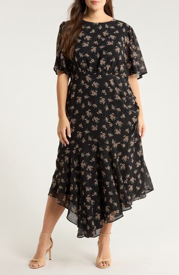 Be the source of romance in the room in a flower-filled dress decked in ruffles and sweetly slanted at the hem.
