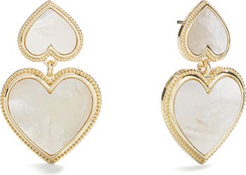 Faux-pearl insets and heart-shaped drops bring soft, romantic detail to these gleaming earrings.