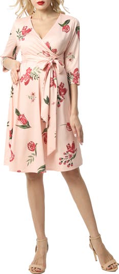 Colorful flowers pop on a bump-friendly dress in a wrap-inspired silhouette that allows you to adjust the tie belt at the waist.