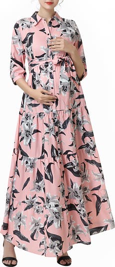 Tropical blooms in striking grey tones pop from the romantic pink backdrop of this long maternity shirtdress with a bump-flattering waist tie. The banded cuffs are softly gathered along with every tier down the skirt to give the effortless look flow and volume.