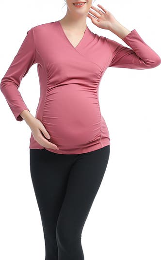 Stretchy, lightweight fabric will keep you comfortable throughout every stage of pregnancy while staying active in this long-sleeve top. Gathered sides flatter your growing baby bump and a surplice V-neck will make nursing discreet and easy once your little one arrives.