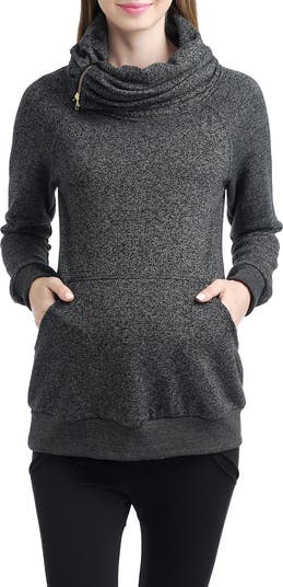 Sweatshirt is well made, soft and oh so warm! I am 5'11" tall, 145 pounds pre-pregnancy and usually wear a size small or 4 in tops. I am currently 4 months pregnant and definitely growing/showing. I ordered this in a size small and it's a little too small with my belly. If I were not pregnant, it would have fit perfectly. I am exchanging this for a medium because I love it so much. The gray color is beautiful, the length hits me perfectly as shown in picture and the gathered neck with zipper is so cute. I highly recommend this sweatshirt for anyone, pregnant or not. This will be my go-to sweatshirt for a while that will go cute with my lululemon leggings, with a pair of jeans or even could pair it with a maxi skirt and flip flops for a cool summer evening in Napa.