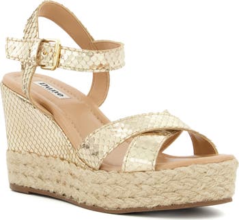 Crisscrossing vamp straps create modern dimension on an espadrille-inspired sandal lofted by a jute-wrapped platform and wedge heel.