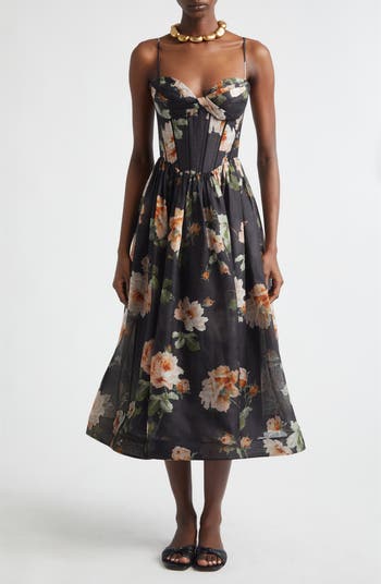 This gorgeous floral midi dress is constructed with a boned corset bodice separated by open-stitch detail, while twisted fabric forms the pleated cups at the romantic sweetheart neckline. Sheer yet textural linen-and-silk organza lends ethereal lightness to the full, gathered skirt of this rose-festooned piece.