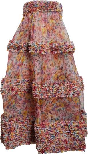 Richly hued watercolor blossoms and a ruffle-ringed silhouette bring the season's bohemian energy and offbeat glamour to this strapless gown that was featured on the runway for the label's spring '26 collection. The beguiling style is made from sheer silk organza with tulle-ruffle tiers.