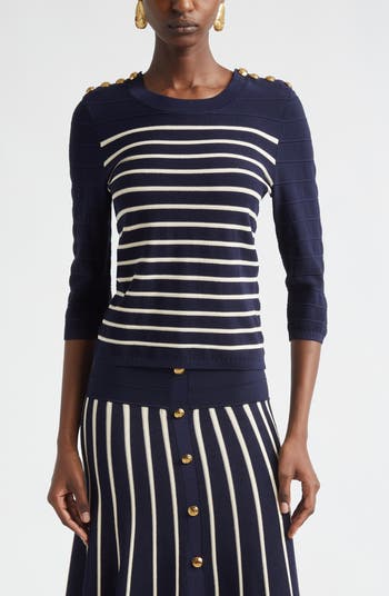 From Nicky Zimmermann's spring '26 Kindred Spirit collection, this sweater evokes nostalgia with its button-detailed shoulders and striping achieved through a mix of jacquard knitting and tailored seaming.