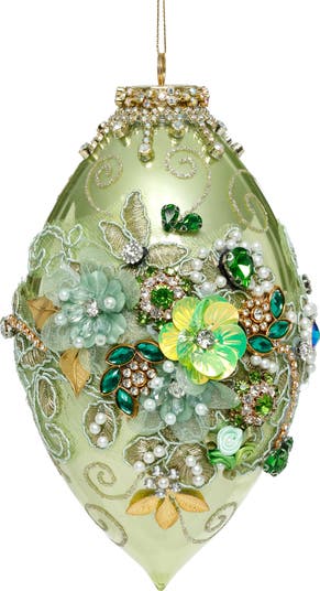 This is a green jeweled finial ornament, elegantly designed with intricate beadwork and sparkling embellishments. The ornament features emerald and gold accents, adorned with pearls, crystals, and floral appliqués. Its luxurious craftsmanship gives it a regal, heirloom-quality appearance, perfect for a sophisticated holiday display.