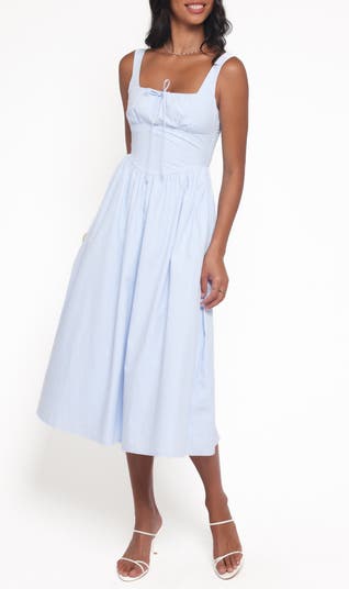 Cut from crisp poplin, this sleeveless flared midi is topped with a fitted bodice and comfortable back smocking.