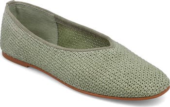 A V-cut topline and intricately woven upper bring sharp angles and dimension to a low-profile ballet flat grounded by a flexible sole.