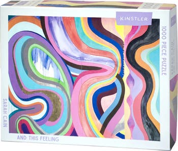 KINSTLER: AND THIS FEELING - 1000 PIECE PUZZLE, 26.5" X 19.15" ASSEMBLED. 1000 piece puzzle featuring the artwork of Sarah Cain. ABOUT THE ARTIST: Sarah Cain brings rooms to life with experiments in color, composition, and non-conformity. Cain modifies canvases by cutting, sewing, and attaching found objects. She also paints floors, walls, and furniture on-site, grounding each space she occupies in the present tense. Her process of creation and destruction is steeped in the history of painting and feminist art practices. and this feeling (2023), incorporates sand and prisms to add a touch of found-object energy to planes of pure color and are typical of Cain's boundless approach to art. She lives in Los Angeles, CA and has had solo exhibitions at the National Gallery of Art, Washington, D.C; Institute of Contemporary Art, Los Angeles, CA; and The Momentary of Crystal Bridges, Bentonville, AR, amongst others. PRODUCT INFORMATION:* 1,000 piece puzzle* Completed puzzle size: 26.5x19.25 in (67.30x48.90 cm)* Designed in Brooklyn, printed, assembled, and packed in the USA. * Made with recyclable materials.