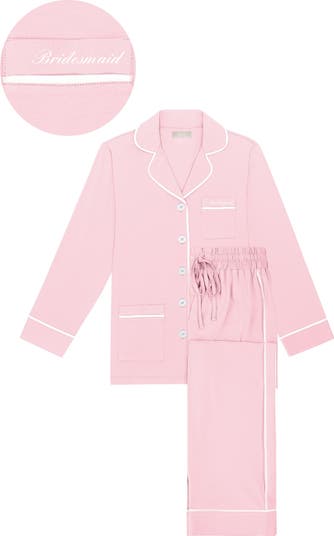 For the bridesmaid, enjoy some extra comfort on the bachelorette trip or special day with this pajama set. Celebrate in four-way stretch cotton with elegant embroidery details.