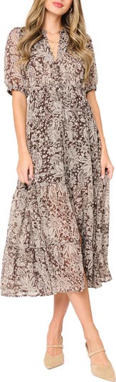 A line of bitty buttons traces the front of this billowy maxi dress articulated by pretty pleats on the back of the bodice.