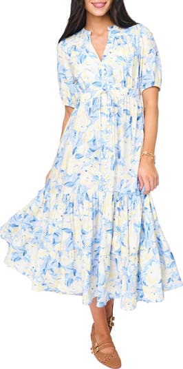 A line of bitty buttons traces the front of this billowy maxi dress articulated by pretty gathering on the back yoke and a tiered skirt.
