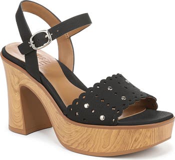 A chunky woodgrain platform and heel loft this breezy sandal detailed with shiny studs and secured by a slender strap at the ankle.