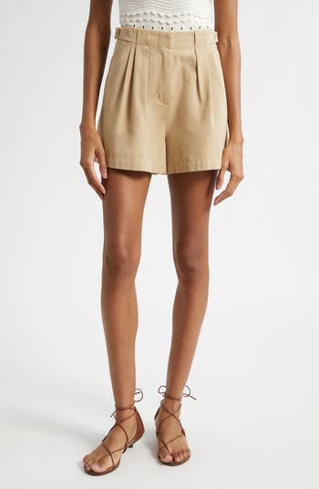 Front pleats and buckled side tabs bring contemporary polish to these cotton shorts finished with handy side-seam pockets.