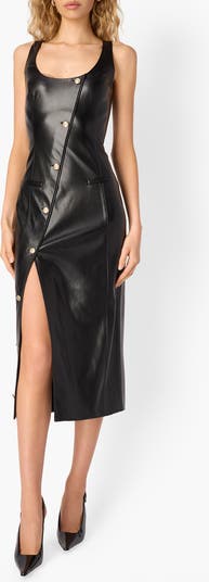 A novel slant on button placement elevates the style of a faux leather dress that serves all the supple swagger of the real deal.