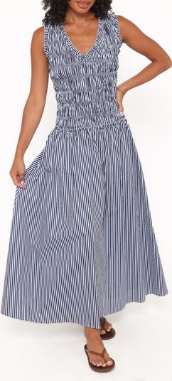 Gathered panels and ruffle trim shapes the bodice of a crisp cotton maxi dress patterned in inky stripes.