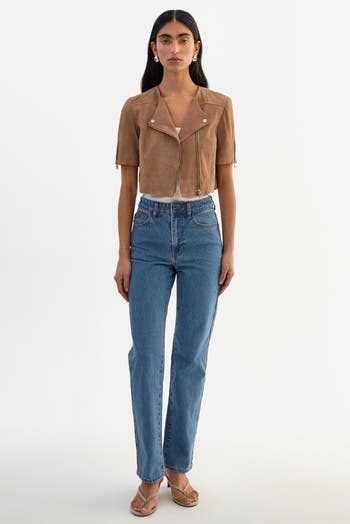 Unexpected in all the right ways, the KIRSI Suede Cropped Jacket jacket brings a softer edge to a classic silhouette. Designed with an asymmetrical front opening and elbow-length zip sleeves, it hits right at the waist for a flattering, modern fit. Crafted from supple goat suede, it offers a refined, tactile feel that transitions effortlessly from day to night.