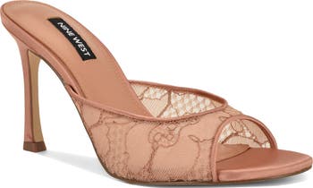 This lovely slip-on sandal is fashioned from delicate lace and matte satin and is perched on a sleek stiletto heel for the perfect night-out style.