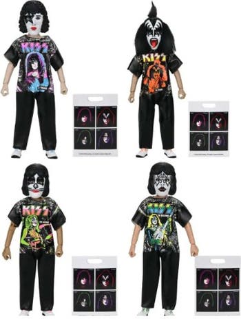 Rock and roll meets retro Halloween in this electrifying addition to the Ben Cooper Costume Kids Collection! NECA celebrates the legendary band KISS with fully poseable, 6-inch figures based on the licensed kids costumes from two of the largest Halloween costume manufacturers from the 1950s - 80s. Featuring faithful recreations of the original Collegeville costumes, this wave includes the Starchild, the Demon, the Spaceman, and the Catman. Each costumed action figure wears a mask and soft goods clothing replicating the signature vinyl look of the classic costumes and includes a trick-or-treat bag accessory with throwback artwork. Every figure is sold separately and packaged in a numbered, retro-style window box that pays homage to the classic costume packaging.