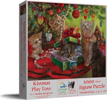 Experience the magic of the holidays with the enchanting Kissmas Play Toys 1000 Piece Jigsaw Puzzle by SunsOut Puzzles. Renowned artist Sandra Bergeron's captivating artwork brings to life a whimsical Christmas wonderland filled with charming kittens playing among beautifully wrapped presents and twinkling ornaments. Crafted with care, this durable puzzle boasts precision interlocking pieces made from high-quality recycled cardboard for a seamless and satisfying assembly process. SunsOut Puzzles are made using eco-friendly materials, including soy-based inks and premium recycled-board, reflecting a commitment to sustainability and superior quality. As a proud woman-owned small business, SunsOut Puzzles manufactures its products in the USA and also offers a worry-free guarantee addressing issues with missing or damaged pieces for a stress-free experience. The Kissmas Play Toys jigsaw puzzle makes a thoughtful and delightful gift for adults and puzzle enthusiasts, offering hours of entertainment and relaxation while enjoying the beauty of Sandra Bergeron's licensed artwork to create cherished holiday memories. Its finished dimension of 23" x 28" makes it a stunning holiday piece to display in your home.