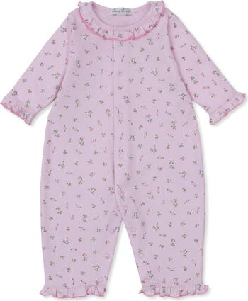 Sweet roses blossom atop cozy coveralls trimmed with ruffles and designed with snaps between the legs to make diaper changes quick and easy.