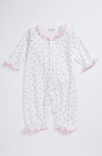 Sweet roses blossom atop cozy coveralls trimmed with ruffles and designed with snaps between the legs to make diaper changes quick and easy.