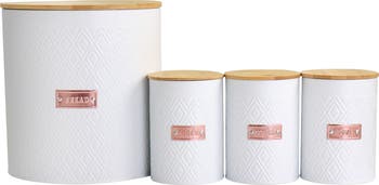 Keep your kitchen neat and organized with this food storage and organization 4 piece canister set by MegaChef. Each canister has an embossed diamond pattern design with a rose gold label plaque, helping you to keep track of your food essentials in a neat and stylish way. wood lids keep an air tight seal when closed, locking in freshness. Lightweight iron cylinders are powder coated in white and are durably made for long lasting use. Set comes with three 4.2in x 6in canisters (with sugar, coffee, and tea labels), and one large 9.4in x 10in bread canister.