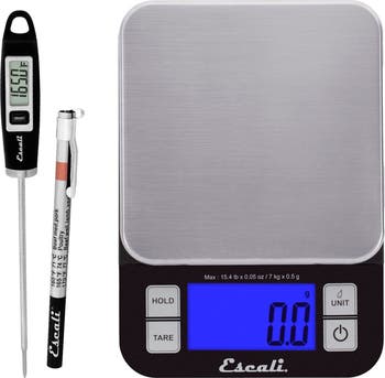Take the guesswork out of cooking, baking, and candy making by weighing ingredients and measuring the internal temperatures of foods for better results and consistency. This Escali scale and thermometer set consists of a Nutro digital kitchen scale and a DH1-B gourmet digital thermometer to cover all of your cooking and baking needs. The NSF certified Escali Nutro Digital Scale features a large easy-to-read back-light display, touch sensitive controls and a raised stainless steel platform that is dishwasher safe. Use the Display Hold function to hold measurements on display when weighing oversized items, and use the Tare function to clear the weight of a container or multiple items on the scale. Three AAA batteries included. The Escali DH1 Gourmet Digital Thermometer is stylish and ergonomically designed. An extra-long probe for extended reach and a comfort grip handle ensures this premium thermometer is ready for prolonged use.