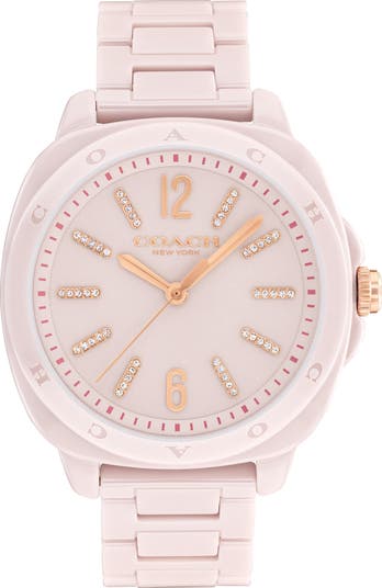 Numeral and crystal-encrusted indexes make an elegant statement on this striking timepiece designed with precise quartz movement and set on a sleek ceramic bracelet.
