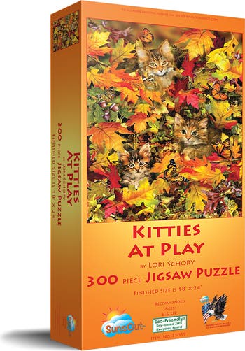 Dive into the enchanting world of "Kitties at Play", a beautifully crafted 300-piece jigsaw puzzle by SunsOut Puzzles. Acclaimed artist Lori Schory brings playful kittens to life, set against a backdrop of vibrant autumn leaves. The 18" x 24" puzzle offers a captivating blend of nature and whimsy that appeals to adults. However, the charm of the imagery is equally matched by quality of the puzzle's construction; SunsOut prides itself on its commitment to precision, using high-quality recycled cardboard for durable, perfectly interlocking pieces. Devotees to puzzle-solving can rest easy knowing SunsOut's robust customer service covers any issues with missing or damaged pieces. Moreover, those conscious about their environmental impact will appreciate SunsOut's commitment to sustainability; the puzzles utilize soy-based inks and recycled boards. Proudly made in the USA, you'll feel good supporting a woman-owned small business with a rich tradition of quality and artistry. SunsOut offers fully licensed designs from top artists that inspire and delight. With "Kitties at Play", your puzzling pastime becomes an unforgettable adventure of both serene beauty and charming details.